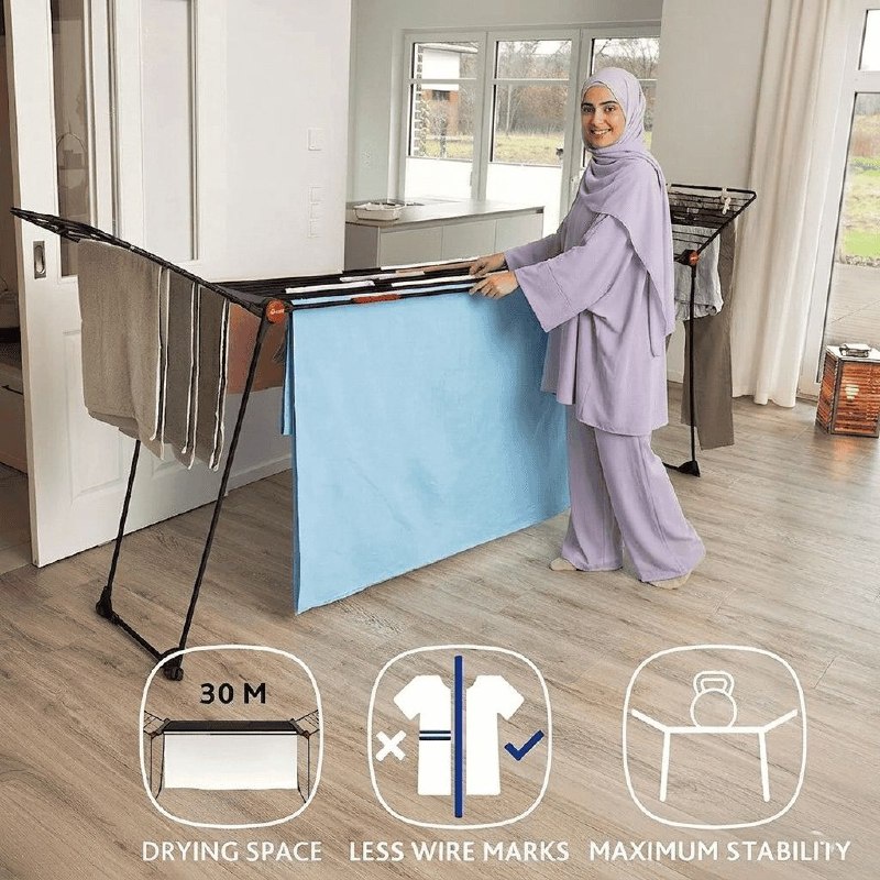 شبكة تلسكوبية قابلة للتمدد، أجنحة عالية لتعليق كل الملابس، تصميم أسود أنيق، ثابت وسهل الاستخدام لتجفيف أسرع وأكثر راحة.